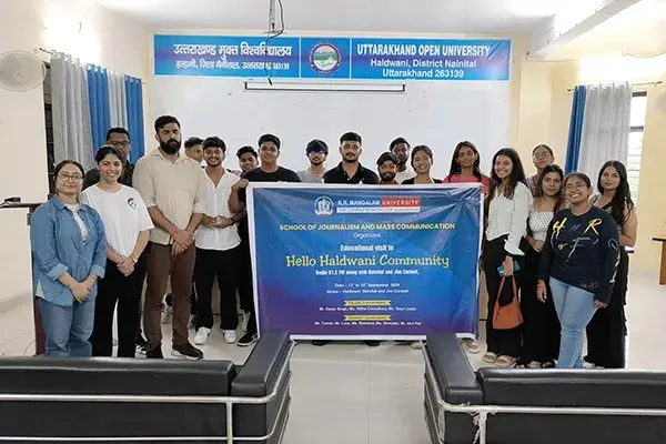 On the first day of their three-day educational visit, SJMC students had an enriching experience at Hello Haldwani 91.2 FM Community Radio. Dr. Rakesh Rayal, Associate Professor and Incharge of the station, delivered an insightful lecture on the relevance, functioning, challenges, and opportunities of community radio, highlighting its critical role in empowering local communities. Students observed live station operations, interacted with the RJ, and interviewed Radio Journalist Ms. Shiwani Bhaskar, gaining hands-on experience. Notably, the Journalism Department of Uttarakhand Open University expressed interest in establishing an MOU with SJMC, to foster academic collaboration.