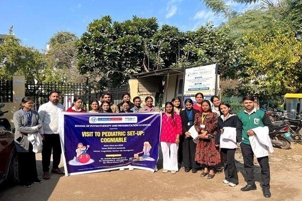 School of Physiotherapy and Rehabilitation Sciences organised a field visit to CogniAble, Gurugram to gain hands-on experience in paediatric physiotherapy under expert supervision. Students participated in clinical assessments, therapeutic interventions, and rehabilitation techniques for children with cerebral palsy, autism, and developmental delays. The visit provided valuable practical exposure, reinforcing evidence-based physiotherapy approaches. The session concluded successfully with positive feedback, enhancing students’ clinical skills and understanding of paediatric rehabilitation.