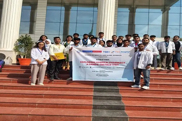 The School of Medical and Allied Sciences organised a field visit to Park Hospital for D. Pharm students. The visit aimed to provide students with practical insights into the role of pharmacists in healthcare. Students learned how pharmacists manage medications, ensure patient safety, and collaborate with doctors and nurses to provide effective care. Students observed pharmacists in drug distribution, medication review, and patient counseling. This visit highlighted the crucial role of pharmacists in healthcare, enhancing students’ practical understanding and preparing them for their future careers.