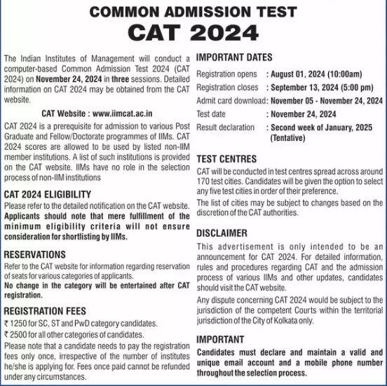 The notification released on July 28 was all over the internet and every other newspaper out there, stating the key highlights of the upcoming examination. The highlights include the CAT 2024 exam date, eligibility criteria, reservations, registration fees, important dates, test centres, a disclaimer, and a note for aspirants.