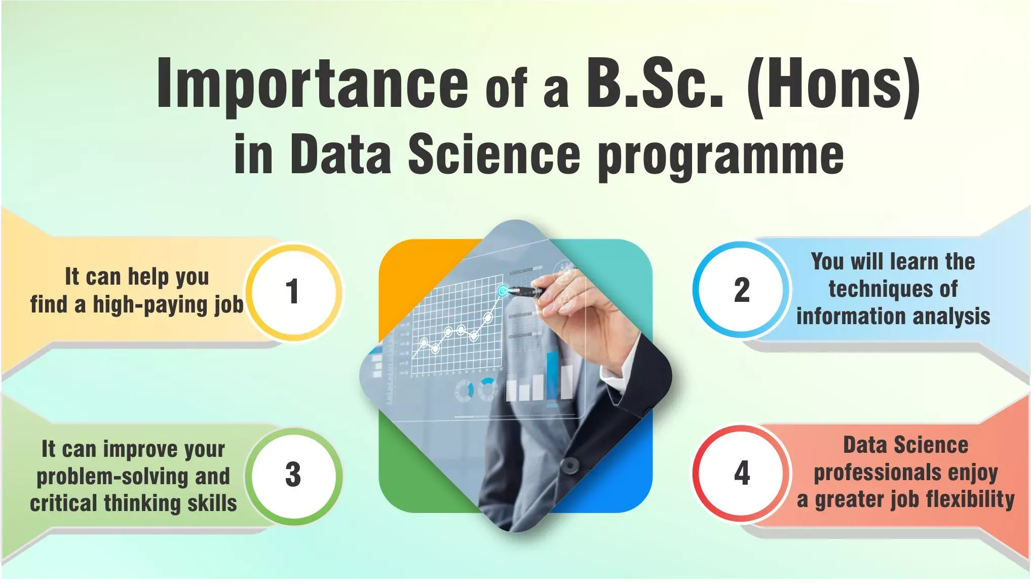 There are many reasons why you should choose to enrol in a B.Sc (Hons) programme in Data Science. First of all, this is a very lucrative field and you can easily find multiple kinds of high-paying jobs if you opt for it. Secondly, this course is great if you want to enhance your professional skills. By enrolling in one of the best Data Science colleges in India, you will get to learn a lot about Statistics and Computer Science. This course will teach you the techniques and theories of many related fields. Besides that, you will also learn problem-solving skills that can be applied to real-world situations and settings. These skills will enable you to tackle various kinds of problems throughout your life. Having this ability can give you an increased sense of self-confidence and the drive to deal with any challenges that come along your professional journey.