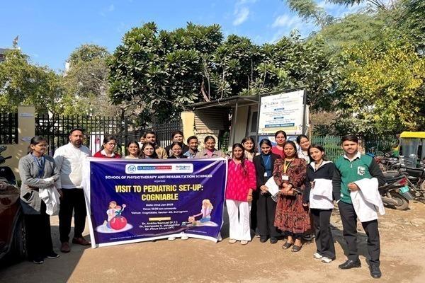 School of Physiotherapy and Rehabilitation Sciences organised a field visit to CogniAble, Gurugram to gain hands-on experience in paediatric physiotherapy under expert supervision. Students participated in clinical assessments, therapeutic interventions, and rehabilitation techniques for children with cerebral palsy, autism, and developmental delays. The visit provided valuable practical exposure, reinforcing evidence-based physiotherapy approaches. The session concluded successfully with positive feedback, enhancing students’ clinical skills and understanding of paediatric rehabilitation.