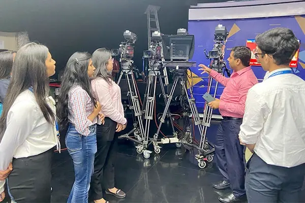School of Journalism and Mass Communication organized an industry visit for students to News 24 Channel situated in Noida. The students of SJMC attended a Live Conclave hosted by News 24 and visited the Prime Time Studio, PCR Room, Radio Studio, and several regional channels of News 24. Moreover, students learnt about the importance of the room lighting and camera placement required for the setting. They were also shown the significance of a teleprompter which is required for the newsreader to present the news. Along with explaining the concepts of input and output, the students were also exposed to the working of both the Production Control Room (PCR) and Master Control Room (MCR).