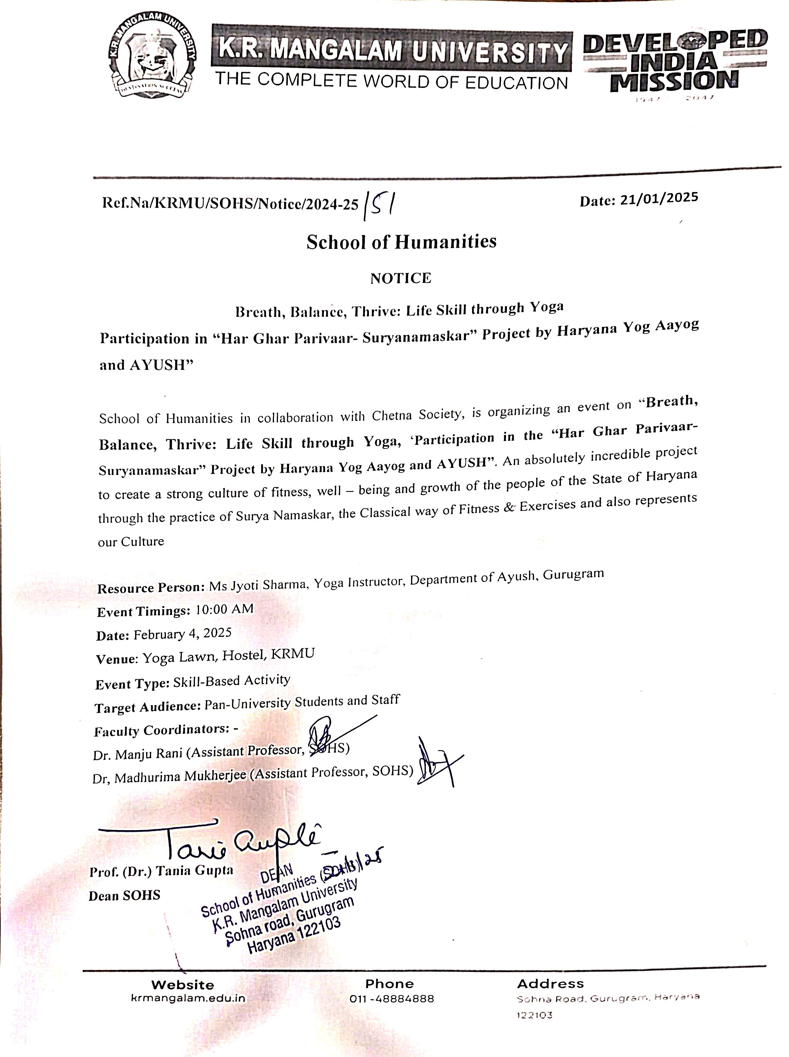 K.R. Mangalam University, established in 2013 under the Haryana Private University Act, is a pioneering institution committed to transformative education and nurturing future leaders.